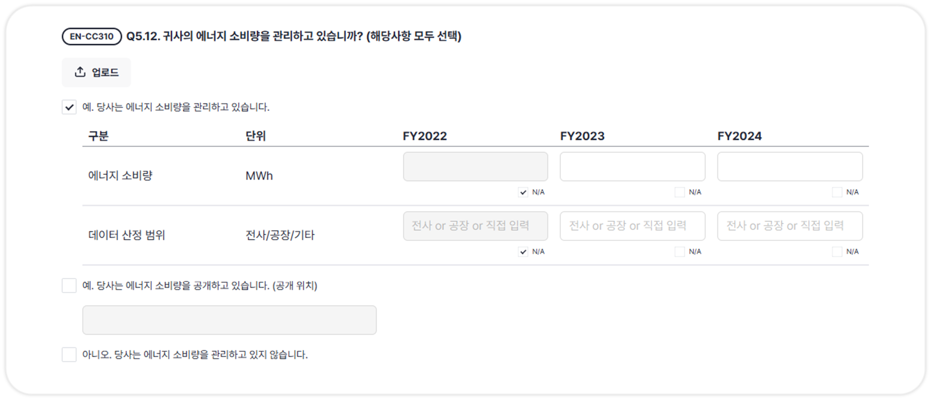 만약 관리하지 않거나 해당되지 않는 값인 경우, N/A 버튼을 체크해주세요.