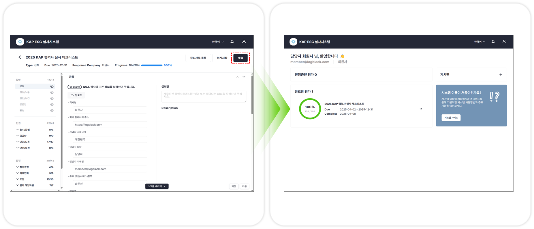 제출 버튼을 눌러서 제출을 수행합니다. 제출이 완료되면, 홈 화면으로 이동하며 평가 기록이 진행중인 평가에서 완료한 평가로 이동했음을 확인할 수 있습니다.