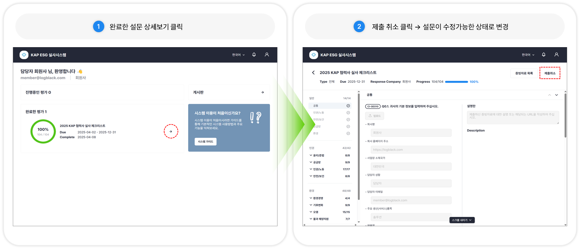 평가 기한 내에는 제출 한 응답을 수정할 수 있습니다.완료한 설문을 제출 취소하면 설문이 수정가능한 상태로 변경됩니다. 수정을 진행한 후, 반드시 다시 제출 버튼을 클릭해서 재 제출까지 완료해주세요.